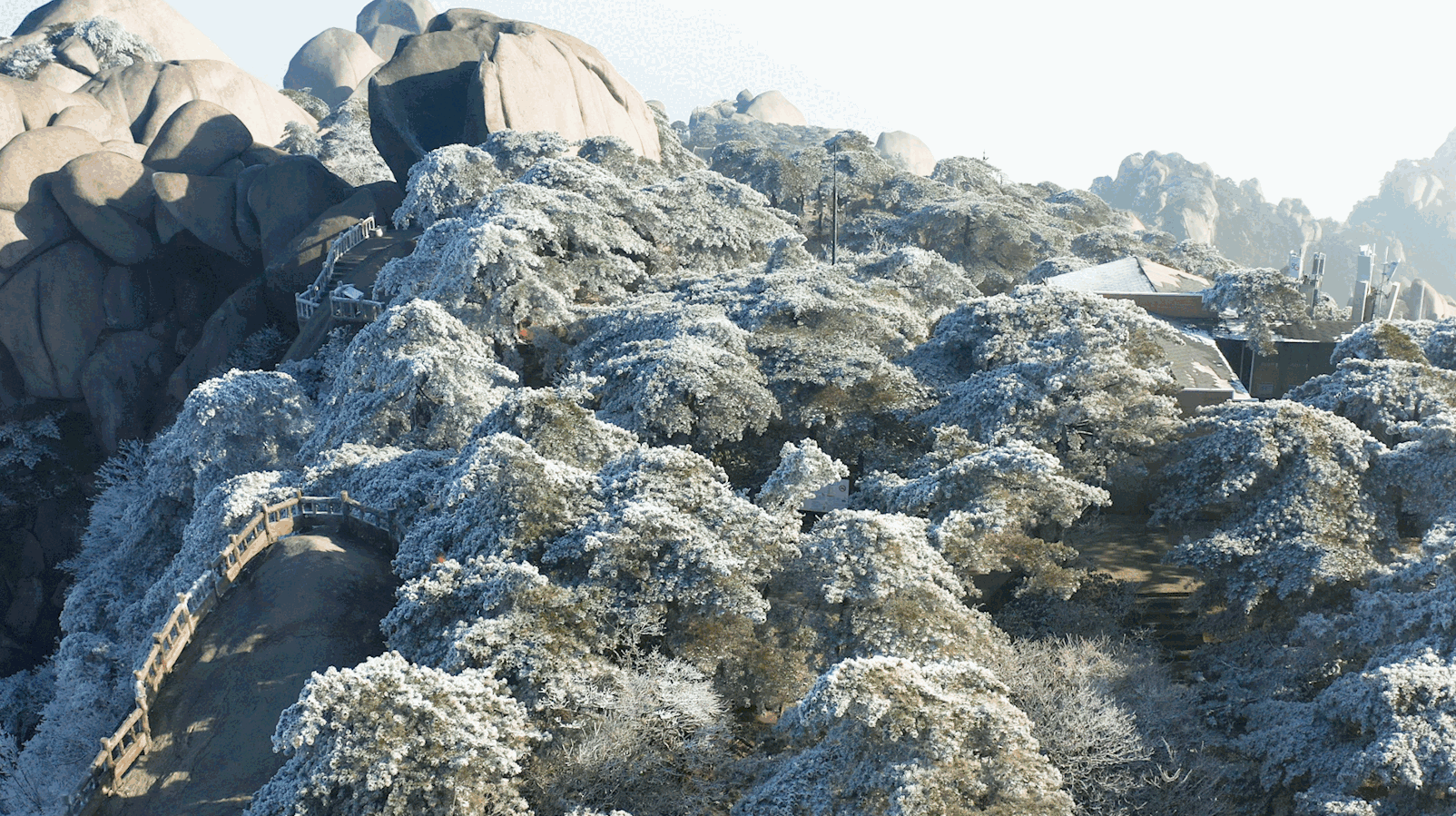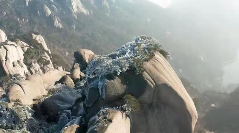 山脊上銀裝素裹,被雪花包裹著的松針猶如海里的珊瑚,在陽光的照射下色彩斑斕、美輪美奐。山谷間云霧繚繞,石如珠玉變幻萬千,猶如瑤池仙境,美不勝收。