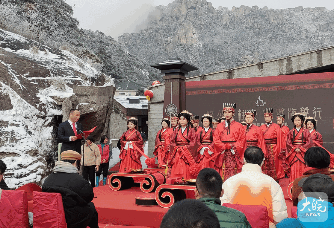 大皖新聞?dòng)??緣分天柱定,山盟海誓行。2月14日上午,在群峰環(huán)繞間,婉若“綠寶石”的天柱山煉丹湖畔,一場穿超千年的“執(zhí)子之手 緣圓天柱”集體婚禮甜蜜舉行。