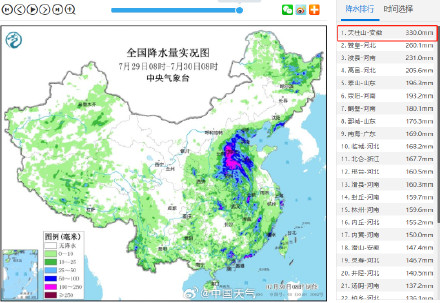受“杜蘇芮”殘留云系影響,安徽天柱山昨天夜間開始出現(xiàn)猛烈降雨,29日08時(shí)-30日08時(shí)的24小時(shí)降水量達(dá)330毫米,達(dá)特大暴雨級(jí)別,是過(guò)去24小時(shí)里全國(guó)降雨最強(qiáng)的國(guó)家站,也是該站點(diǎn)自1949年來(lái)單日降水量第一。