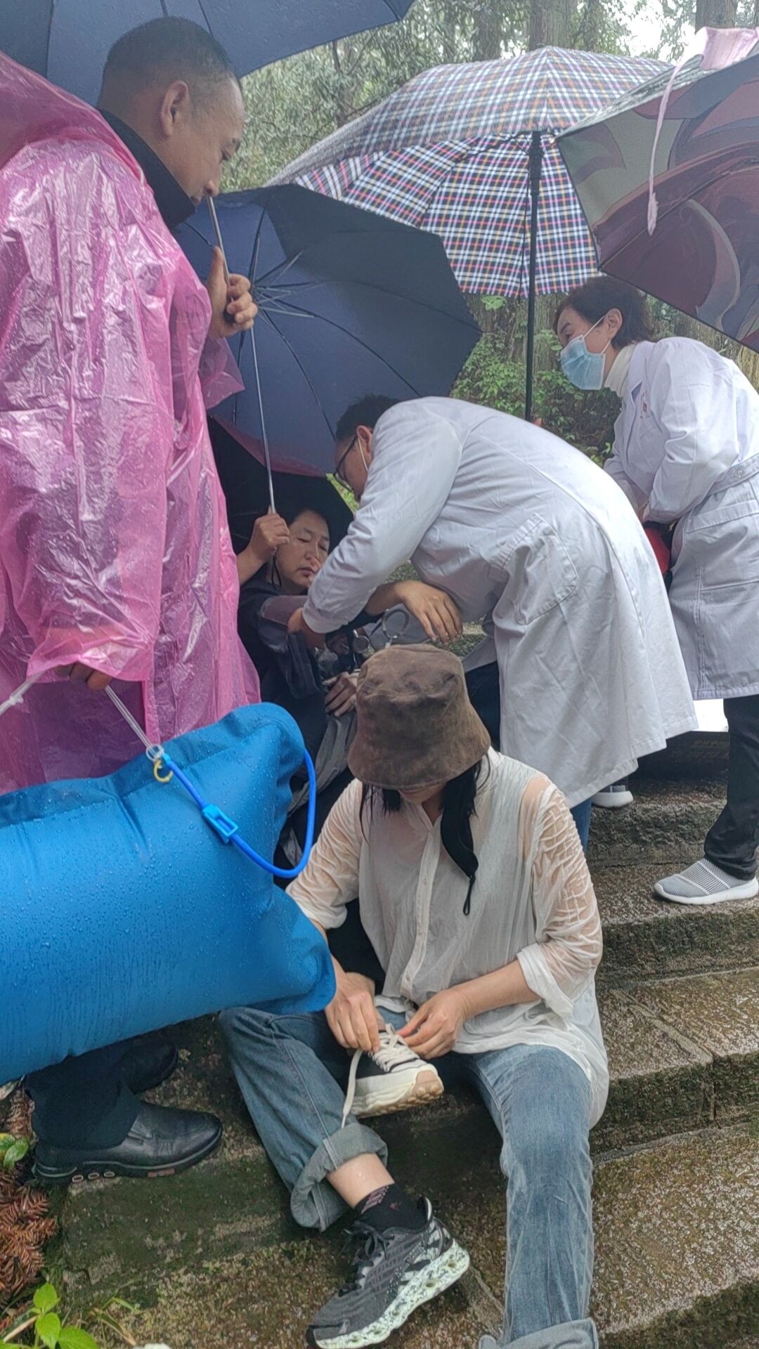 此時此刻,一場與時間賽跑的急速救援的暖心一幕,在天柱山景區(qū)真實上演。到達救援現(xiàn)場,游客高女士呈現(xiàn)心慌、四肢無力、全身發(fā)抖、不能言語、時有惡心等狀態(tài),醫(yī)生給游客認(rèn)真仔細(xì)地做了檢查,表示情況十分危急,需及時到山下醫(yī)院就診。劉星第一時間撥通120急救電話,隊員汪小曲冒雨把高女士從迎真峰背負(fù)至牧羊河索道上站,路程約四五百米,然后坐索道下山并將游客抬上救護車,送往潛山市中醫(yī)院就診,稍微歇停背負(fù)的汪小曲,已累得癱軟一旁,站立不穩(wěn)。
