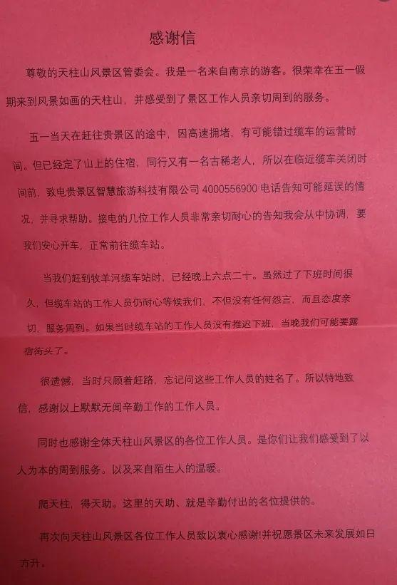 “感謝天柱山風(fēng)景區(qū)默默無聞辛勤工作的工作人員,是你們讓我們感受到了以人為本的周到服務(wù),以及來自陌生人的溫暖,祝愿景區(qū)未來發(fā)展如日方升……”5月8日下午,天柱山景區(qū)收到了一封來自南京游客的感謝信。紙短情長,字字暖心,流露出對天柱山工作人員的充分認(rèn)可和信賴,深切地表達(dá)了對天柱山景區(qū)的感激之情。
