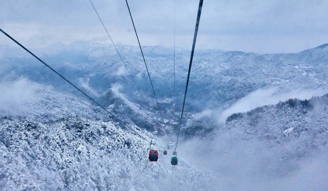 當(dāng)日的天柱山銀裝素裹,霧凇滿枝,宛若仙境。